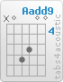 Guitar chord diagram Aadd9 (x02420) with photos and fingering positions.