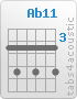 Guitar chord diagram Ab11 (464646) with photos and fingering positions.